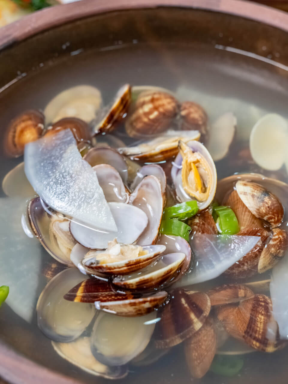 국물은 맑고 시원한 타입이라 깔끔하게 입가심하기 좋고, 조개가 넉넉히 들어가 풍미가 진해요.