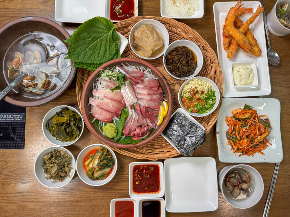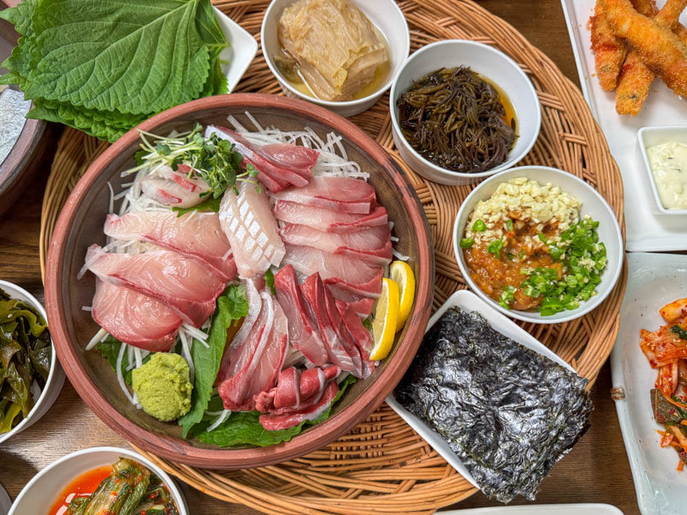 회만 계속 먹다 보면 심심해지는데, 한상 구성은 뜨끈한 국물부터 튀김, 밑반찬, 쌈채소까지 균형이 좋아서 끝까지 맛있게 먹을 수 있더라고요.